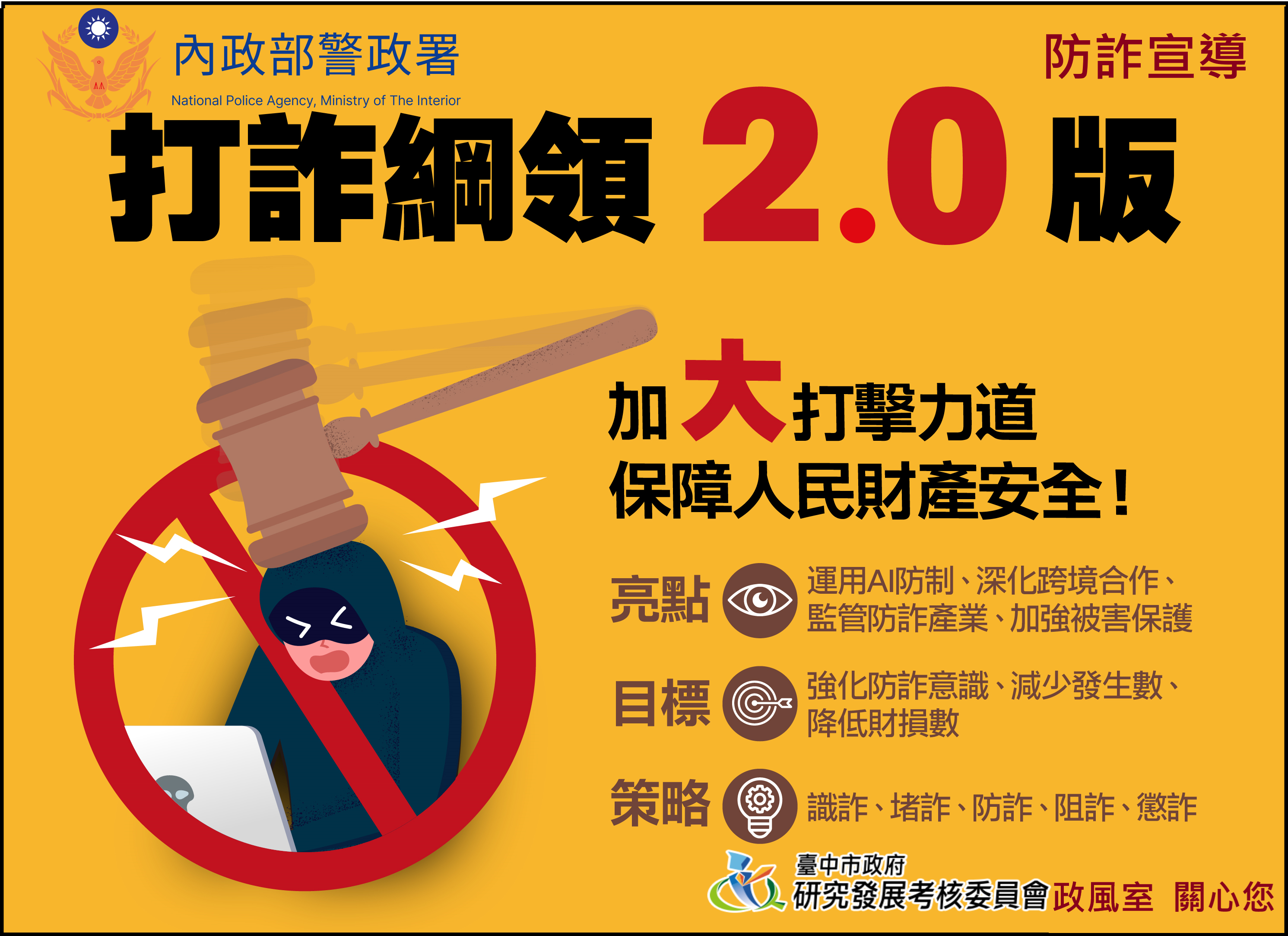 新世代打擊詐欺策略行動綱領-識詐-20 「新世代打擊詐欺策略行動綱領2.0」自114年1月1日起至115年12月31日止(計2年)。為持續落實「新世代打擊詐欺策略行動綱領」-「識詐」,以「行政一體」之思維,從中央各部會延伸至各地方政府局處單位,建立「打詐臺中隊」,跨機關協力執行防詐宣導,並提高民眾認識詐騙手法知能。