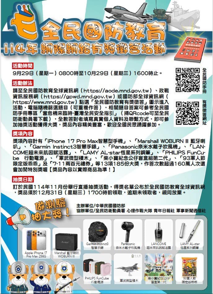 國防部民國114年全民國防教育「網際網路有獎徵答活動」