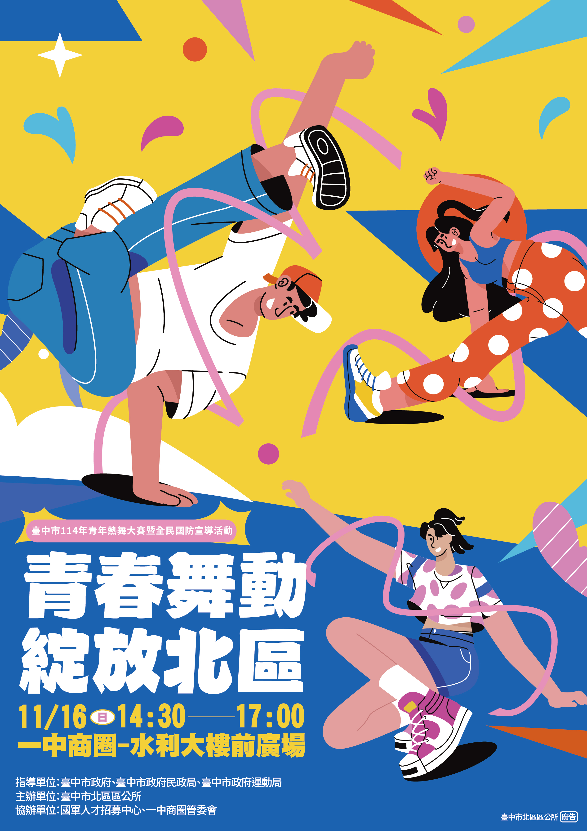 為鼓勵青少年投入正當休閒運動活動,透過熱舞調劑身心與培養運動精神,並藉機向大眾宣導全民國防之重要,舉辦「臺中市114年青年熱舞大賽暨全民國防宣導活動」。