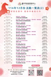 臺中市家庭教育中心邀您一起參與本月精彩多元的課程活動~從親職教育、婚姻經營、數位教養、青少年溝通、幼兒教養到性別教育及婚前交往準備等主題應有盡有,讓我們在溫馨互動的氛圍中學習,累積創造幸福、和諧家庭的力量!