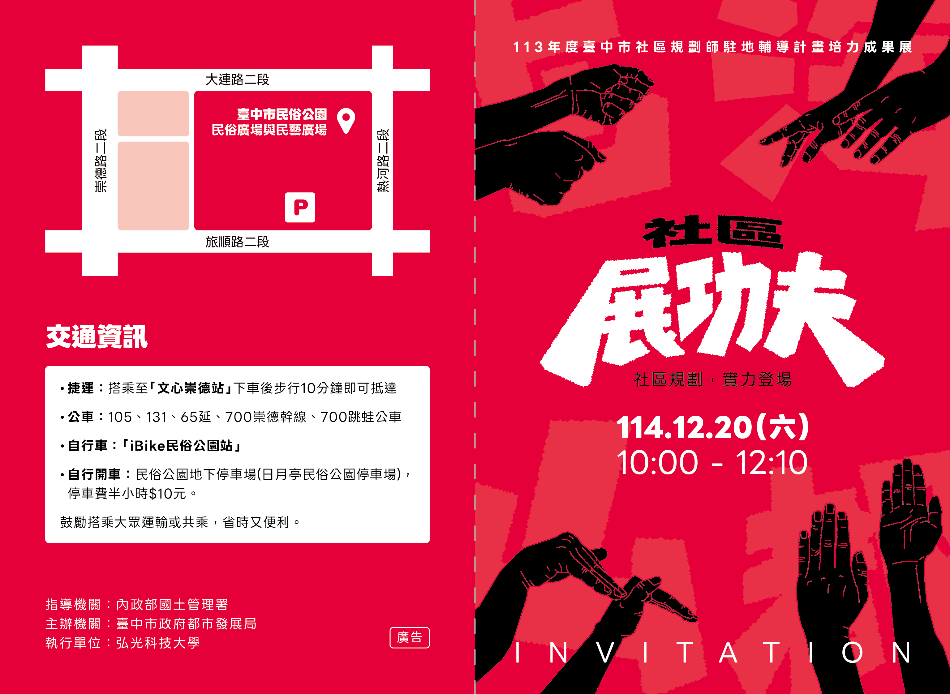 誠摯邀請您蒞臨113年度「臺中市社區規劃師駐地輔導計畫」社區環境自力營造成果展,感受臺中市幸福城市魅力。