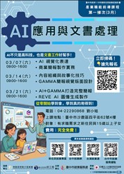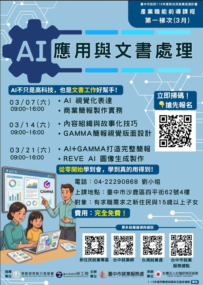 活動日期: 115年3月7日(六)09:00-16:00。 115年3月14日(六)09:00-16:00。 115年3月21日(六)09:00-16:00。 上課地點:臺中市沙鹿區四平街62號4樓。 報名方式:請上「臺中市政府就業服務一鍵catch報名網」網站報名或填寫報名表掃描或拍照email至valenxx@taichung.gov.tw。 洽詢電話:(04)2229-0868劉小姐。 檢附「AI應用與文書處理培訓前導班」職能前導課程報名簡章及報名表如附件。