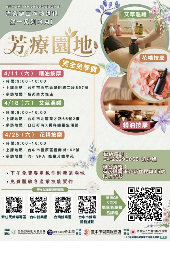 【協助宣導】臺中市就業服務處委託社團法人台灣新移民協會辦理「芳療園地」產業鏈工作坊,鼓勵待業新住民踴躍報名參與