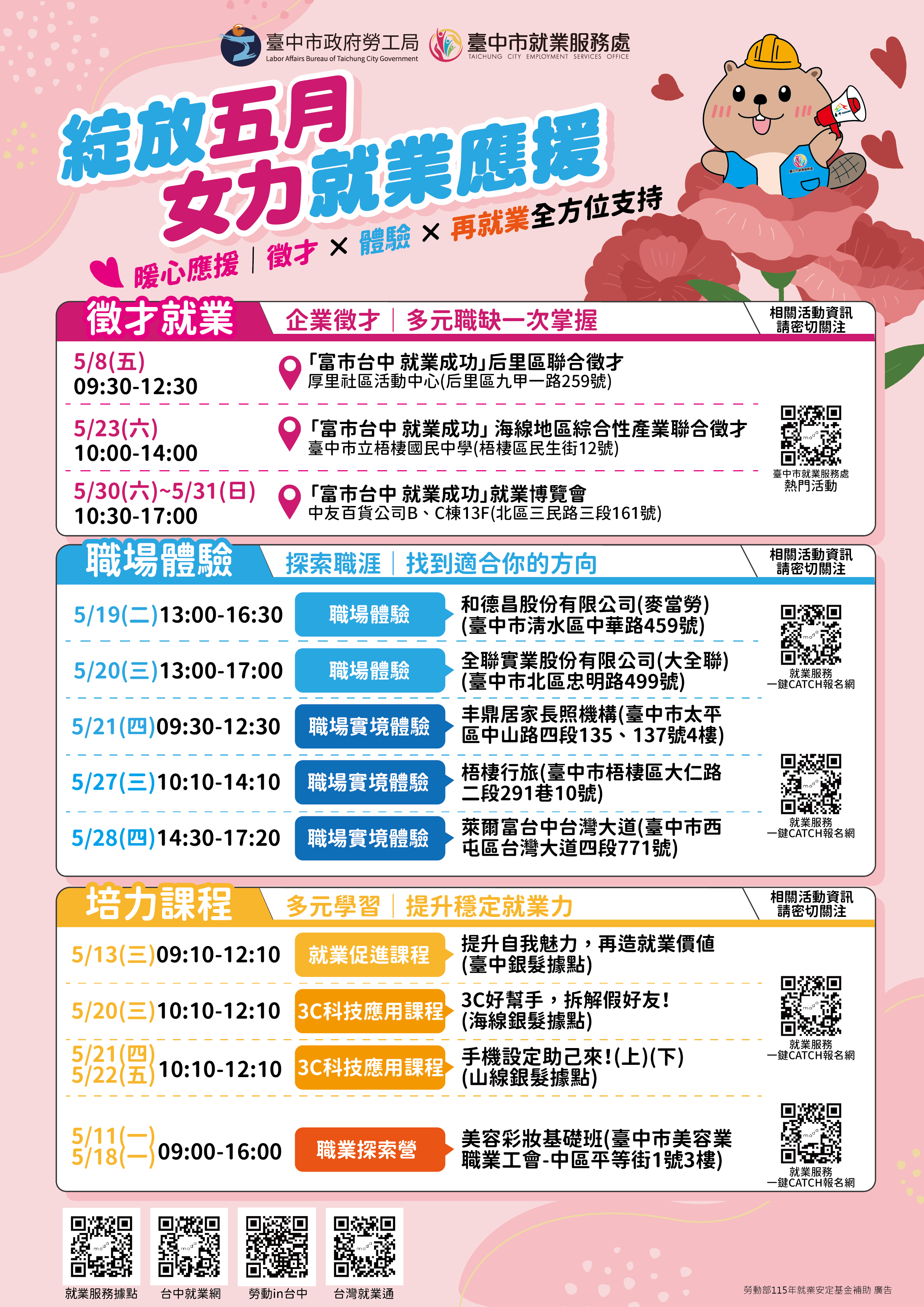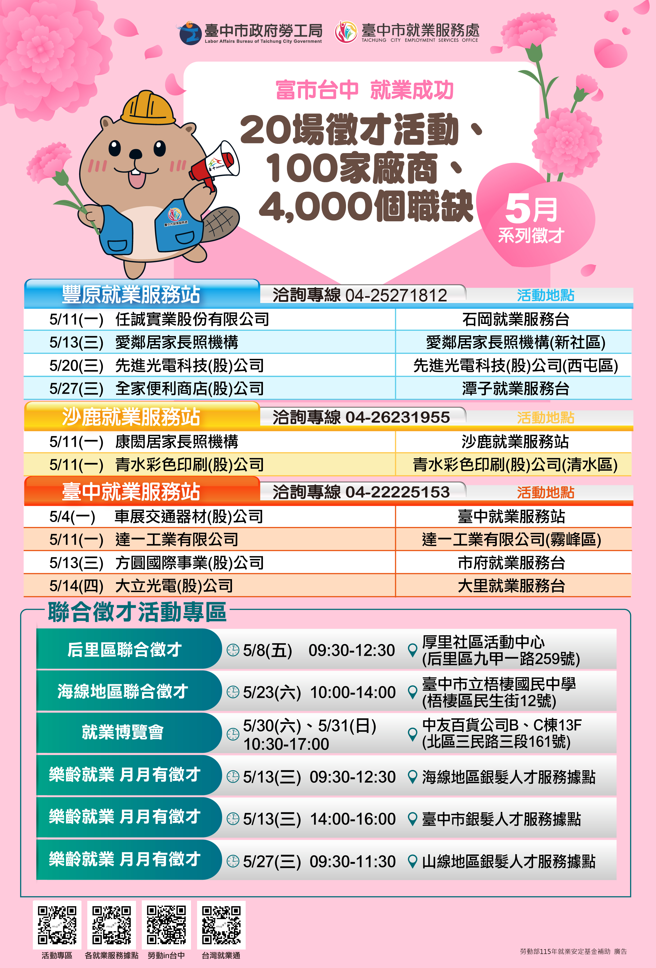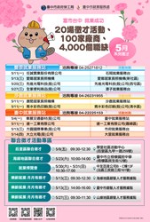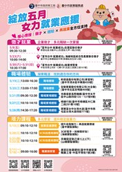 溫馨五月暖心就業應援!中市府5月份20場徵才超過4,000個職缺!邀集矽品精密、大銀微等廠商,歡迎市民朋友踴躍參加,詳情請洽市府總機轉36100洽詢。